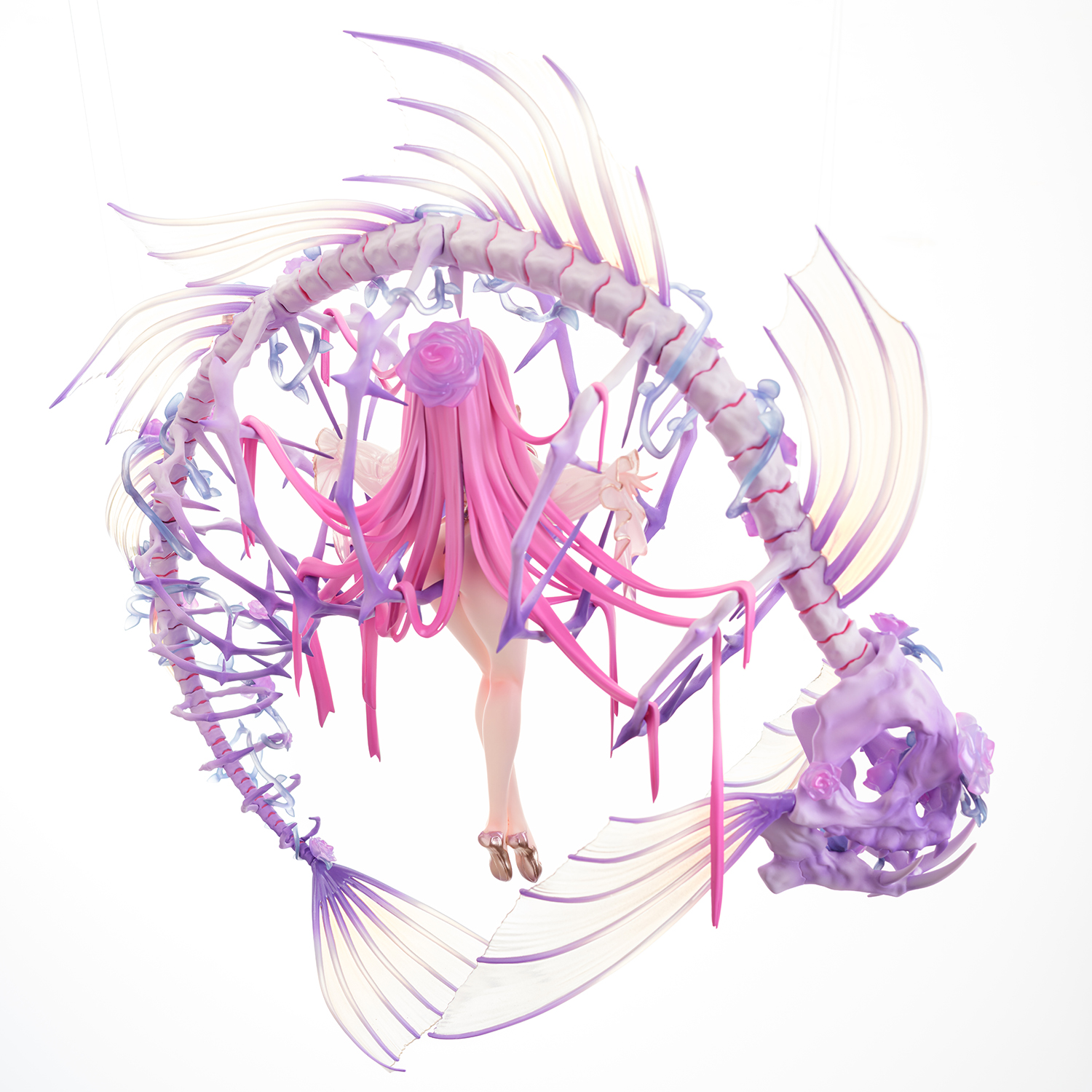 魚の骨に吊られるようなデザインの本作品では静と動を感じさせるような立体表現をしています。